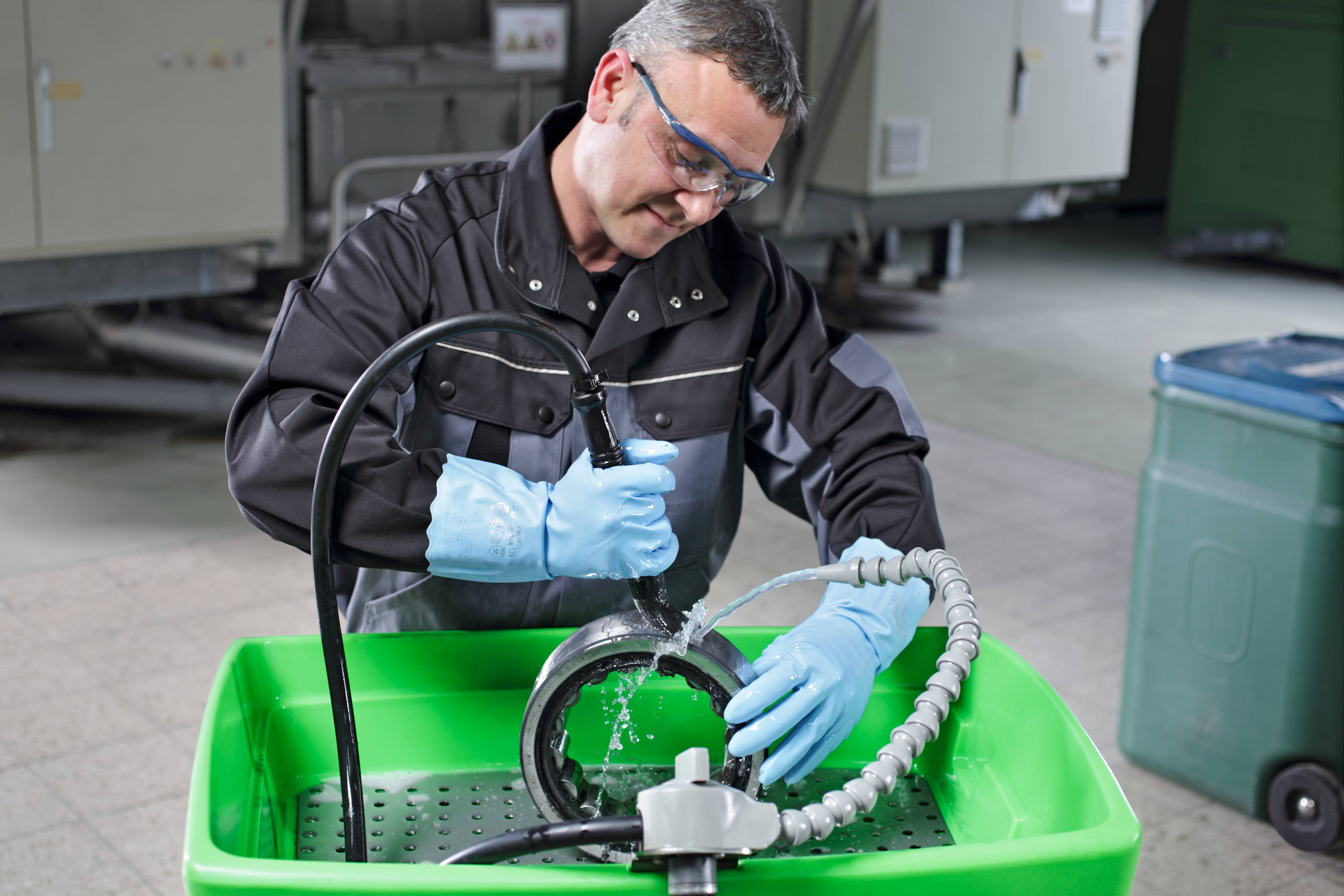 A diferència dels netejadors en fred convencionals, que es basen en productes químics, amb freqüència substàncies amb COV que suposen un risc per a la salut, les rentadores de peces de Mewa utilitzen un líquid netejador amb base d’aigua. No conté cap etiqueta, això vol dir en llenguatge pla que no hi ha cap risc d’incendi ni per a la salut. A més, en comparació amb els netejadors en fred, el líquid es pot utilitzar durant molt més temps sense pèrdua de qualitat. Això significa que pot estalviar costs i, alhora, utilitzar una solució molt més sostenible en una fase de treball important.