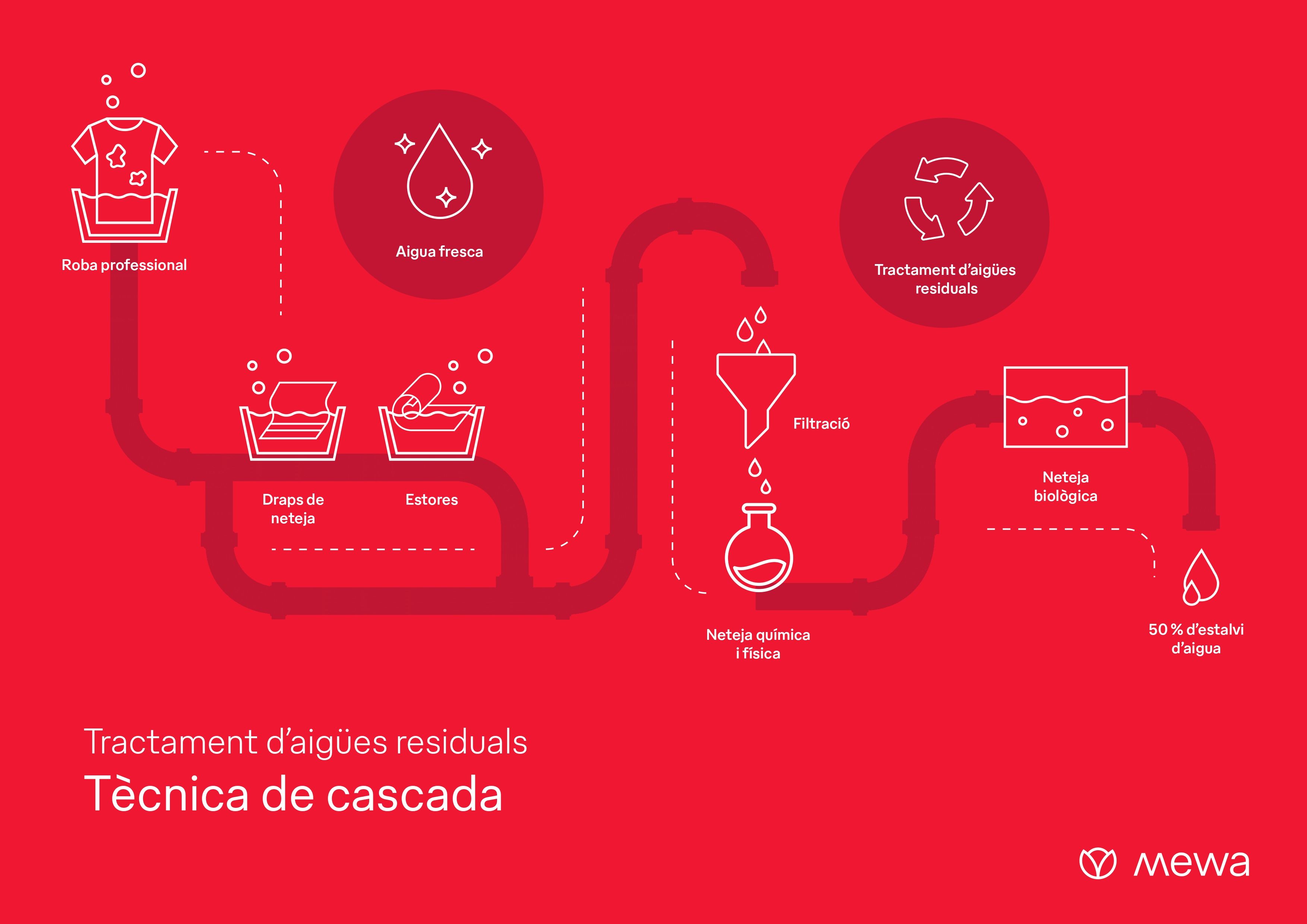 L’any 1975 Mewa va posar en funcionament la primera planta de tractament d’aigües residuals dissenyada internament. Avui, 50 anys més tard, l’anomenada tècnica en cascada continua utilitzant-se amb èxit i, a través d’aquest eficient procediment, l’aigua de l’esbandida es pot reutilitzar. L’aigua dels últims cicles d’esbandida es filtra i després s’utilitza generalment per a les primeres rentades de draps industrials i estores, que solen estar molt bruts. D’aquesta manera, Mewa redueix l’ús d’aigua potable en el procés de rentada fins a un 50 %